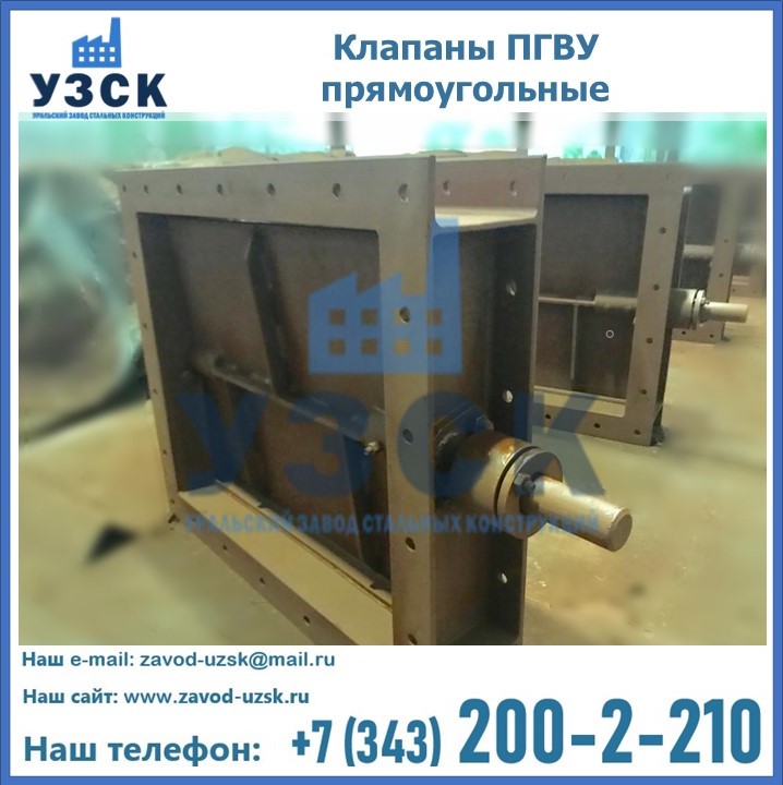 Прямоугольный клапан ПГВУ имеет прямоугольную или квадратную форму, по основному сечению конструкции, на которую устанавливается клапан. Для изготовления в Шымкенте применяются сталь или чугун, в зависимости от модели. Внутри клапана имеется запорный элемент, передвигающийся параллельно общему потоку движения среды. Шибер ПГВУ имеет такую же форму, как и основное сечение. Перемещение створки происходит благодаря возвратно-поступательным движениям.