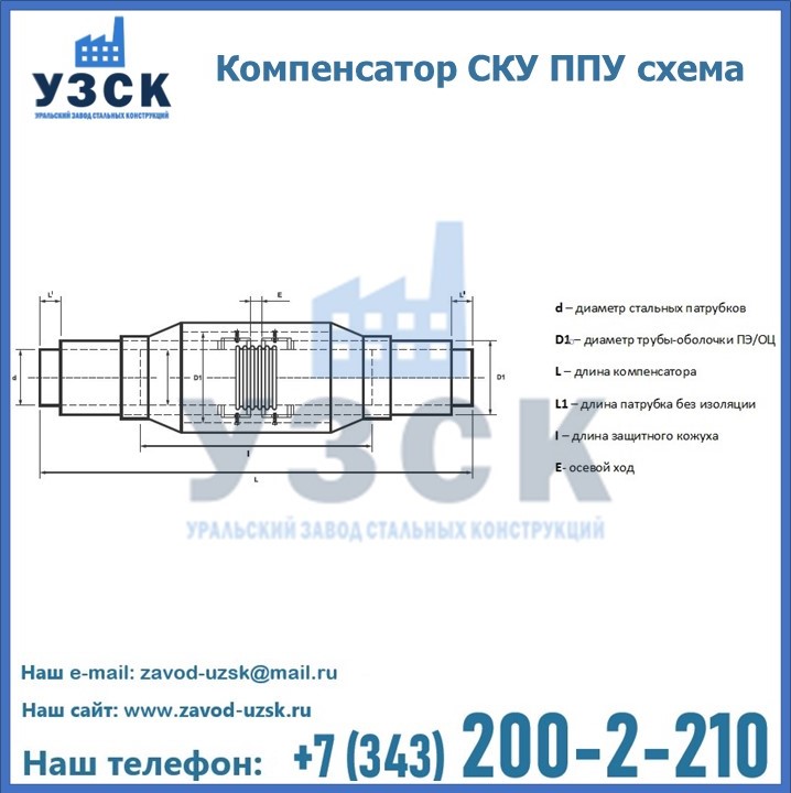 Уральский Завод Стальных Конструкций в Шымкенте предлагает готовые изделия, а также вы можете приобрести компенсатор СКУ ППУ под заказ. Наш завод располагает всем необходимым оборудованием для производства нестандартных позиций компенсатора СКУ в ППУ изоляции. Завод «УЗСК» предлагает большой выбор качественных и надежных компенсаторов СКУ ППУ, полностью укомплектованных и готовых к эксплуатации. Мы гарантируем соответствие нашей продукции всем требованиям ГОСТ и ТУ, износостойкость и высокую производительность. Наше предприятие поставляет и производит оборудование, имеющее длительную гарантию и большой эксплуатационный ресурс. Если вы хотите заказать сильфонные компенсационные устройства СКУ ППУ или другое оборудование с доставкой, наши специалисты помогут рассчитать стоимость транспортных расходов и организуют доставку товара. Вы можете оформить заказ на продукцию на нашем сайте, для этого достаточно заполнить форму обратной связи.